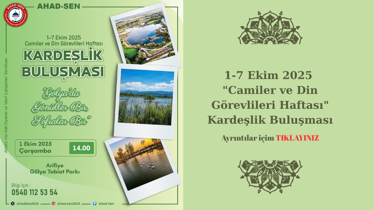İşte AHAD SEN olarak, bu yıl “Camiler ve Din Görevlileri Haftası” vesilesiyle Kardeşlik Buluşması programımızı hayata geçiriyoruz. Çünkü biz biliyoruz ki; birliği diri tutmanın yolu, kardeşliği yaşatmaktan, omuz omuza vermekten geçer.
