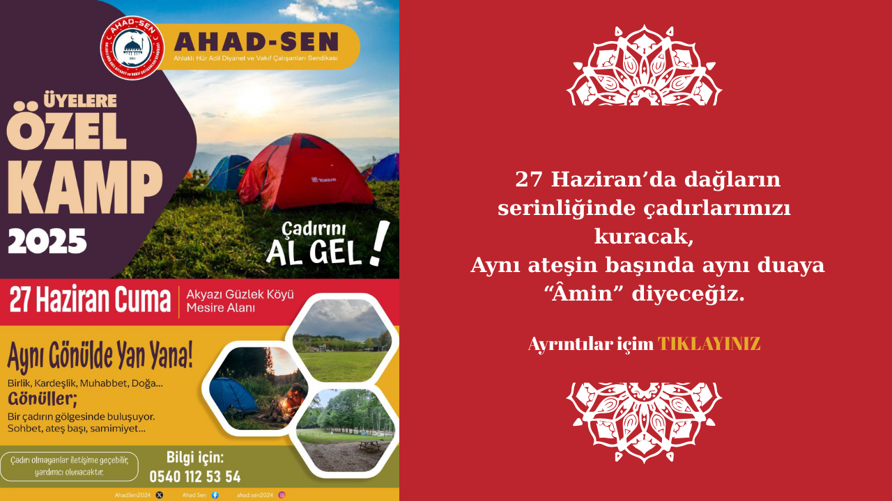 27 Haziran’da dağların serinliğinde çadırlarımızı kuracak, Aynı ateşin başında aynı duaya “Âmin” diyeceğiz. Bu kamp, sendikacılığın rutinden sıyrılıp ruha dokunduğu yerdir.Çünkü biz sadece sendika değiliz…AHAD SEN’iz, bir’iz, beraberiz!