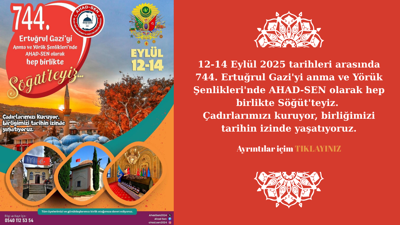 12-14 Eylül tarihlerinde gerçekleştirilecek olan 744. Ertuğrul Gazi’yi Anma ve Yörük Şenlikleri, birlik ve beraberliğimizin nişanesi olacak. Bu kutlu iklime bütün üyelerimizi aynı ruhu paylaşmaya davet ediyoruz.